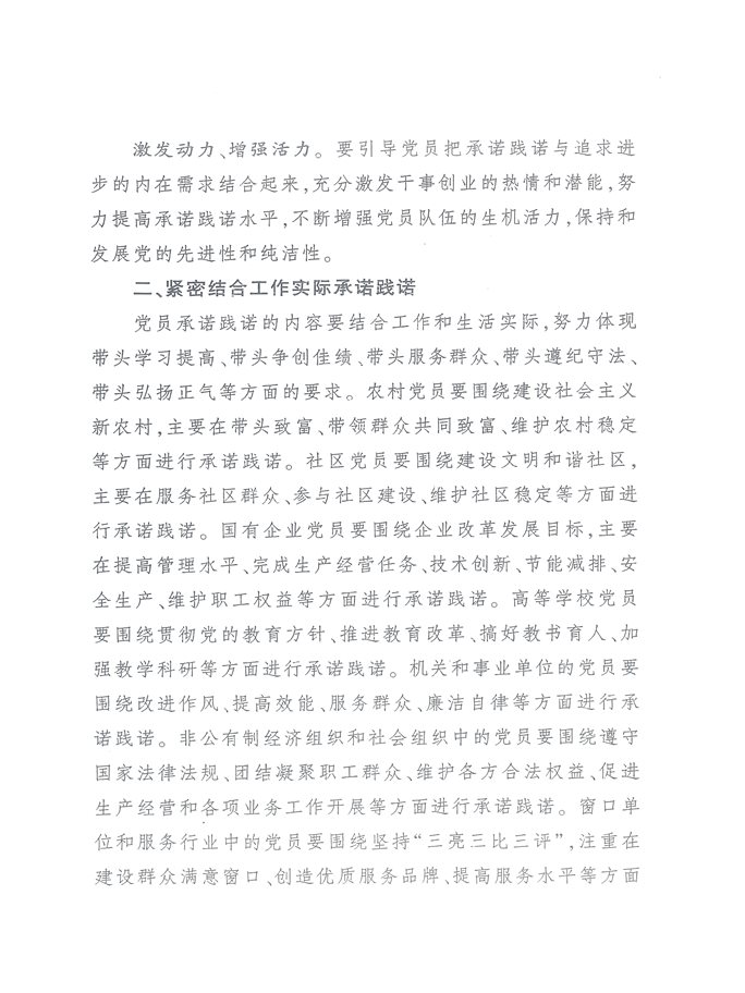 二、各地各单位要突出中心工作、重点任务开展承诺践诺,既要注重结合岗位实际和职责任务,又注重听取群众的意见和建议、回应群众的关切和诉求,切实提高基层党组织和党员承诺践诺的针对性和实效性?/span>