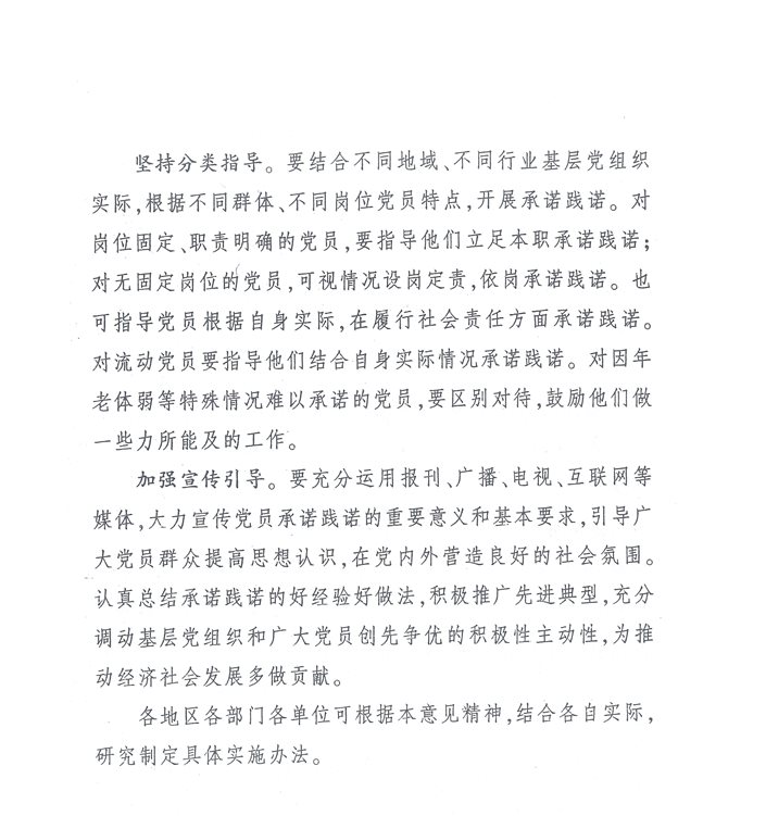 二、各乡(镇)、单位(部门)要引导各级党组织和广大党员紧紧围绕中心工作?/span>重点任务开展承诺践诺,把直接联系服务群众作为承诺践诺的重点内容,把群众满意作为衡量承诺践诺的重要标准,切实提高承诺践诺的针对性和实效性?/span>